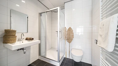 Alle longstay hotelappartementen en hotelstudio's zijn voorzien van een luxe badkamer met een tweede toilet, dubbele wastafel met ledspiegel en luxe douche.